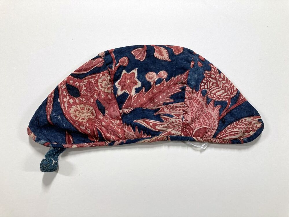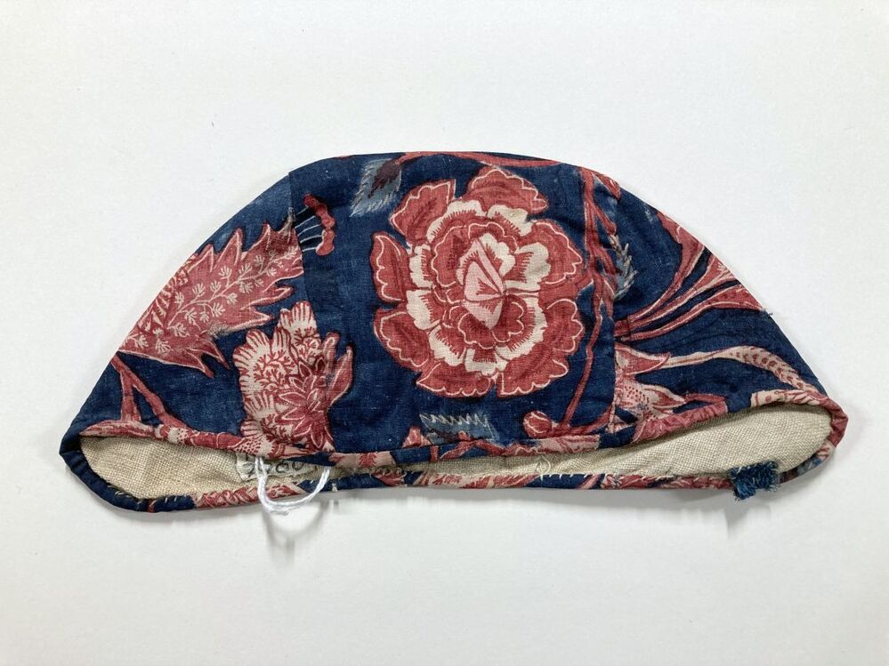Sitsen meisjesmuts, met bizarre motieven en naturalistische bloemen op blauwe grond