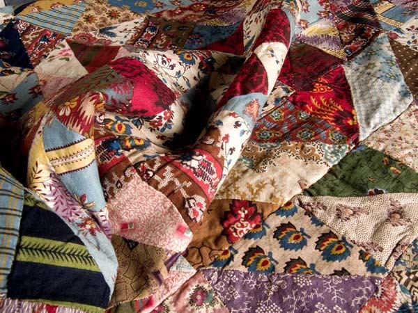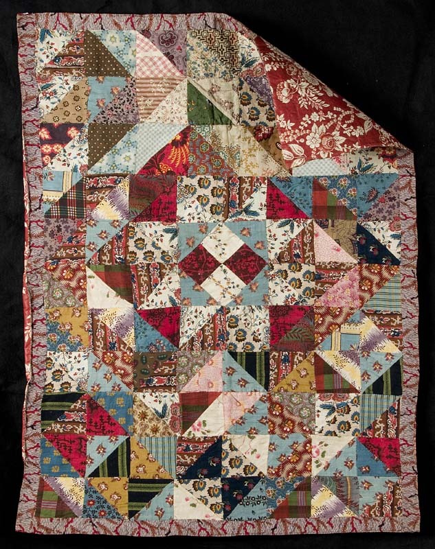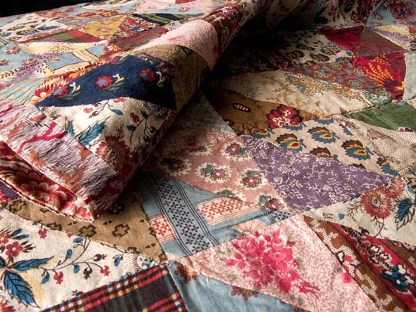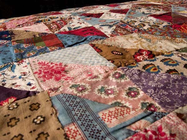 Lappendeken of bedeldeken van bedrukte katoen, bestaande uit schuin gekwartileerde vierkanten, doorgepit