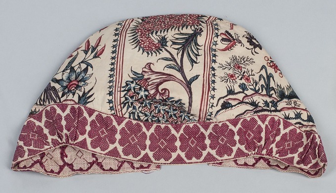 Sitsen vrouwenmuts, vermoedelijk huismuts, afgezet met rood-wit langetband, beschilderd met landschapjes en brede baan met trosbloemen op witte grond