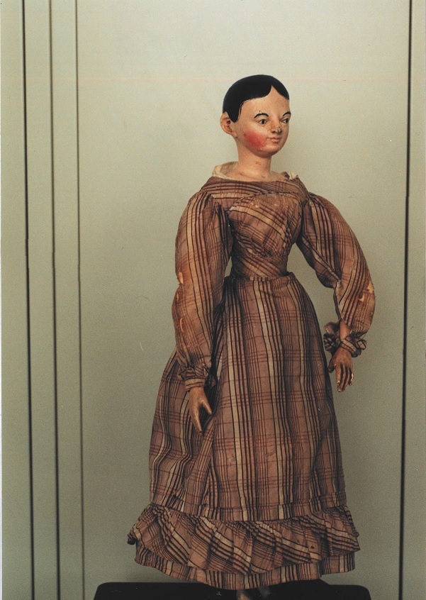 Pop, van hout met beweegbare ledematen en zwart haar, in geruite katoenen jurk