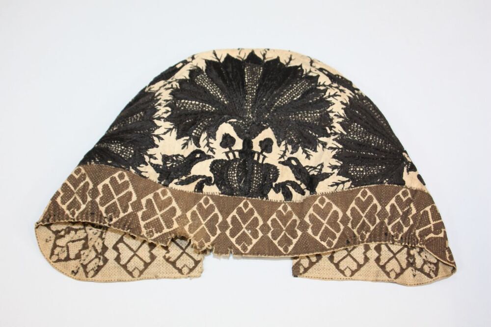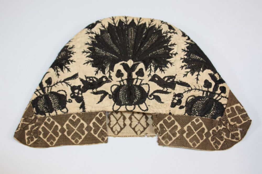 Muts van wit linnen, geborduurd met zwarte zijde, grote zwarte bloem en vogelfiguren