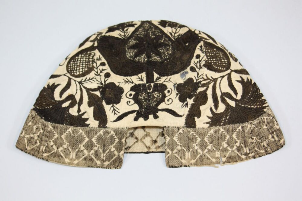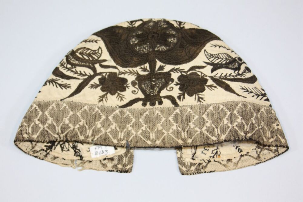 Muts van wit linnen, geborduurd met zwarte bloem en vogelfiguren