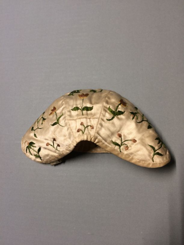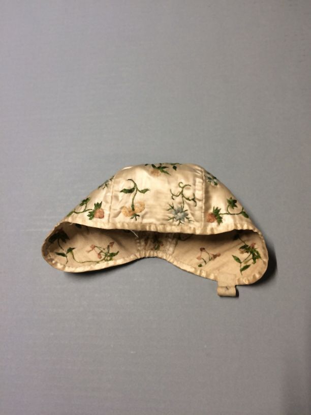 Meisjesmuts van crème satijn geborduurd met zijden bloemen, onderdeel van groep van twee