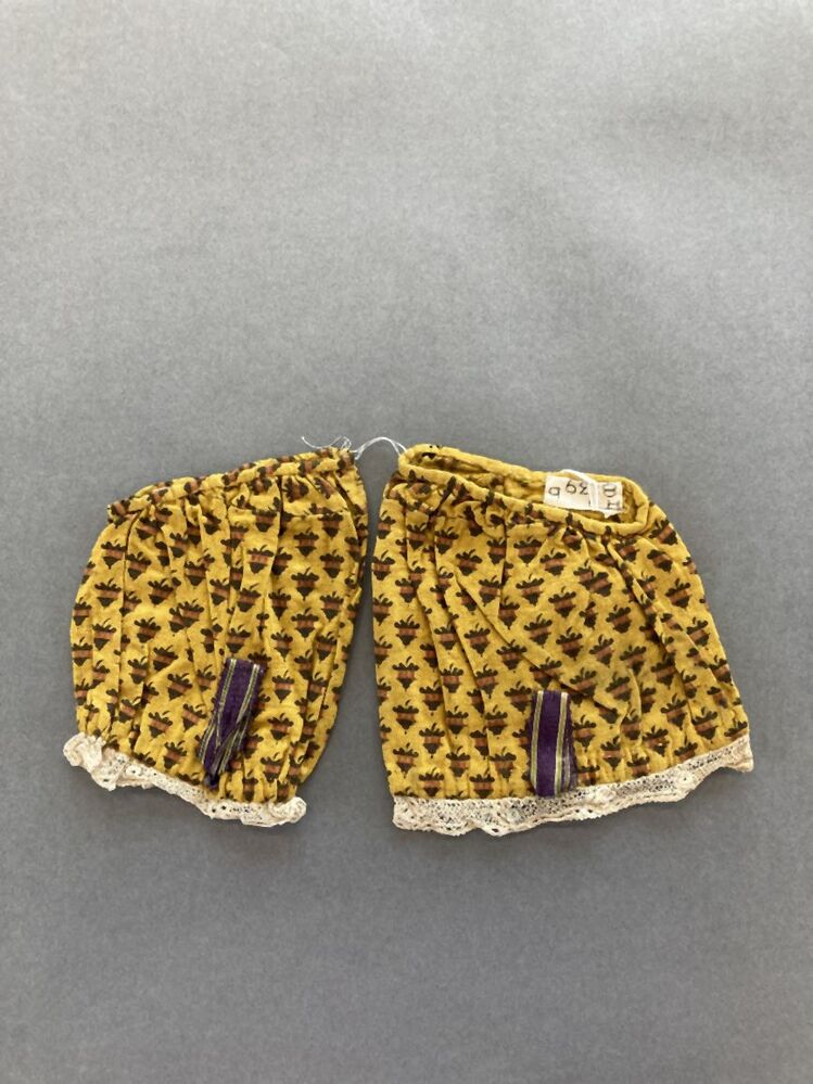 Paar pofmouwen van bedrukt katoen, geel fond, met motiefjes waarin geblokte streep