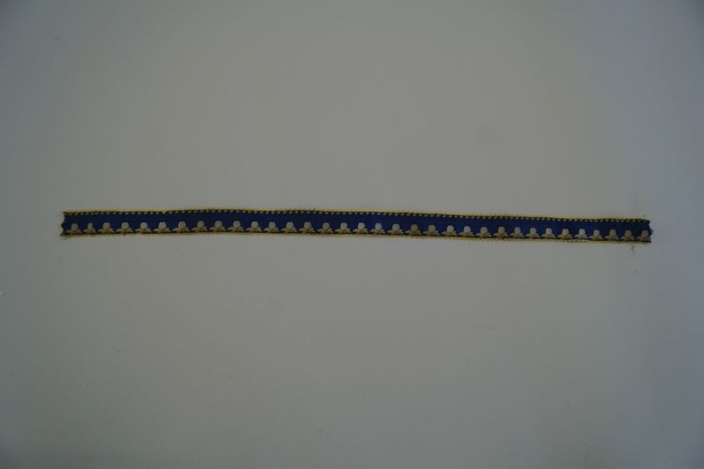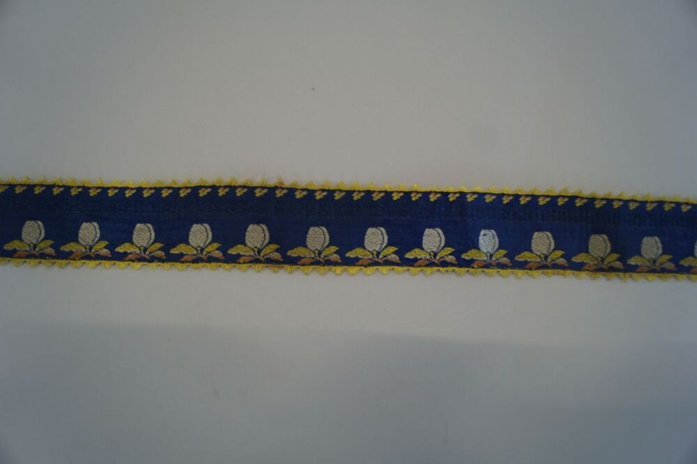 Blauw zijden lint met ingeweven motieven in wit, geel en bruin met onder andere pruimentakjes