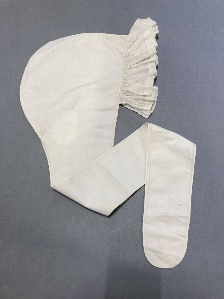 Slaapmuts van fijn wit katoen, met voile voorstrook en lange banden