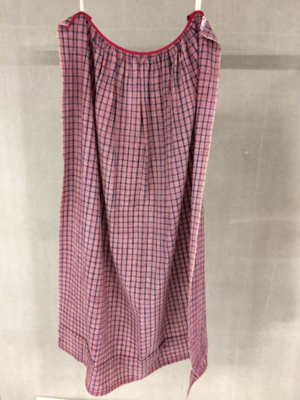 Hindelooper schort van blauw rood wit bont met initialen IT, onderdeel van Hindelooper vrouwenkostuum