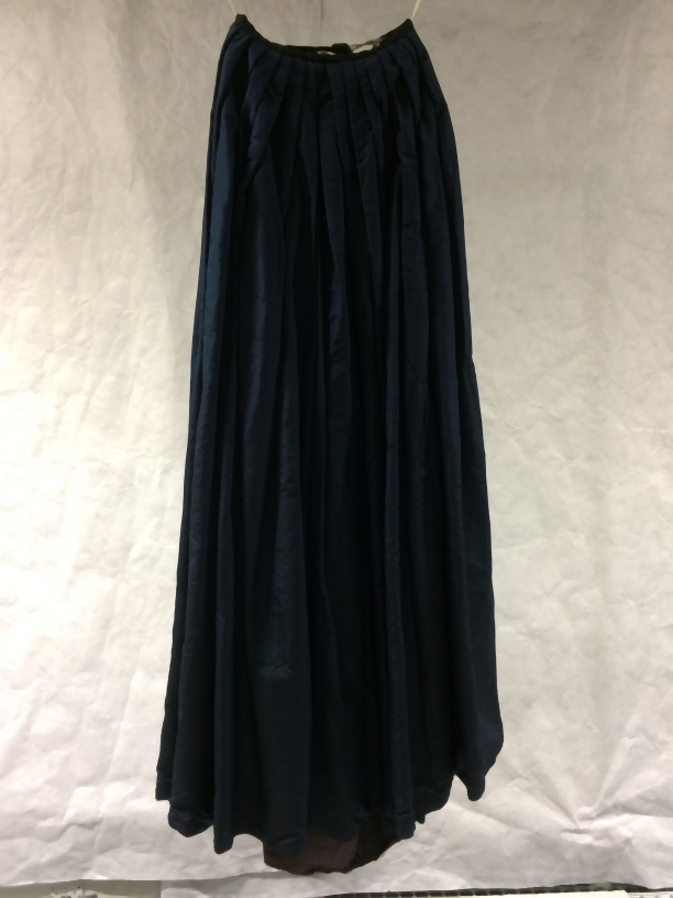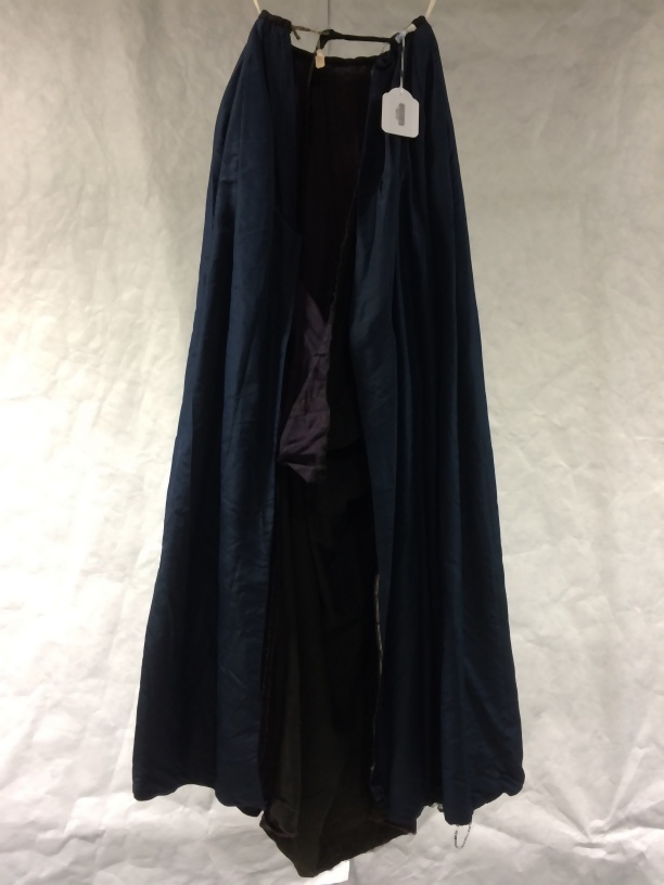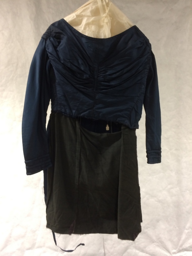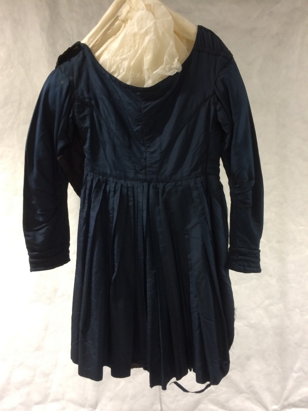 Kostuumjak met gedrapeerd voorpand van donkerblauwe zijde, gevoerd met paarsgevlekt katoen, binnengekomen in groep van tien