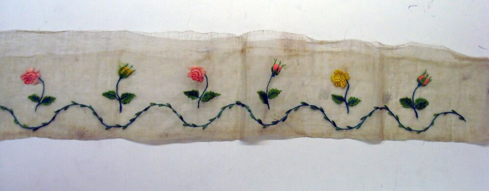 Stuk witte tule waarop in kleuren bloemen en bladslingers zijn geborduurd