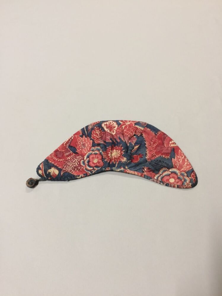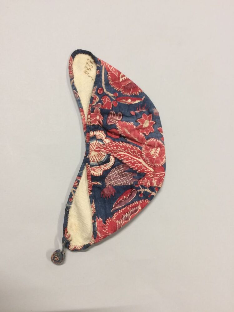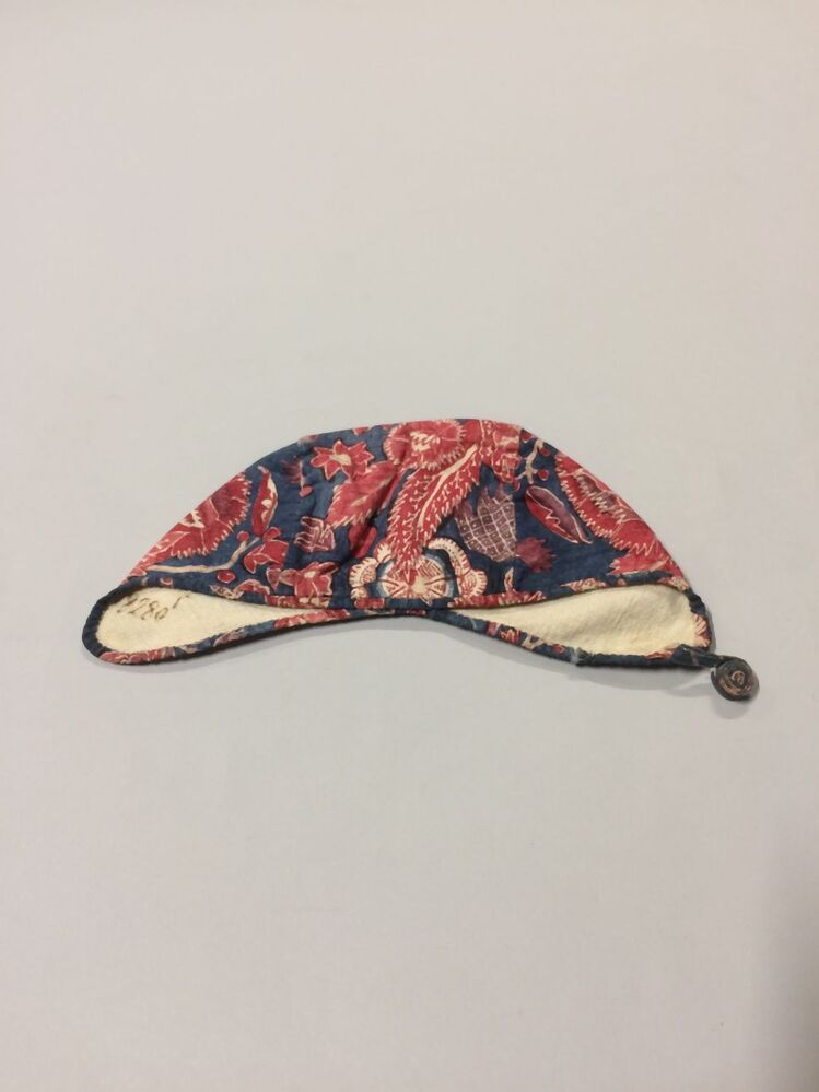 Sitsen meisjesmuts, met bloemen met rastervullingen op blauwe grond,
