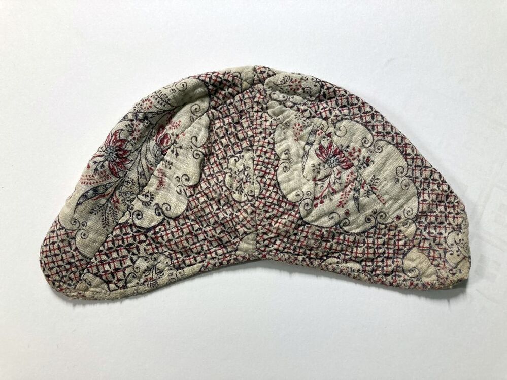 Mutsje van bedrukt katoen, wit en geruit fond met bloemboeketten, onderdeel van groep kinderkleding