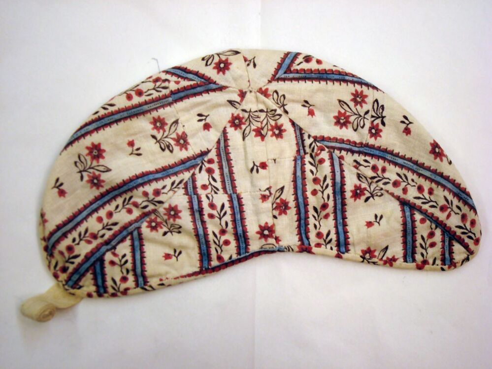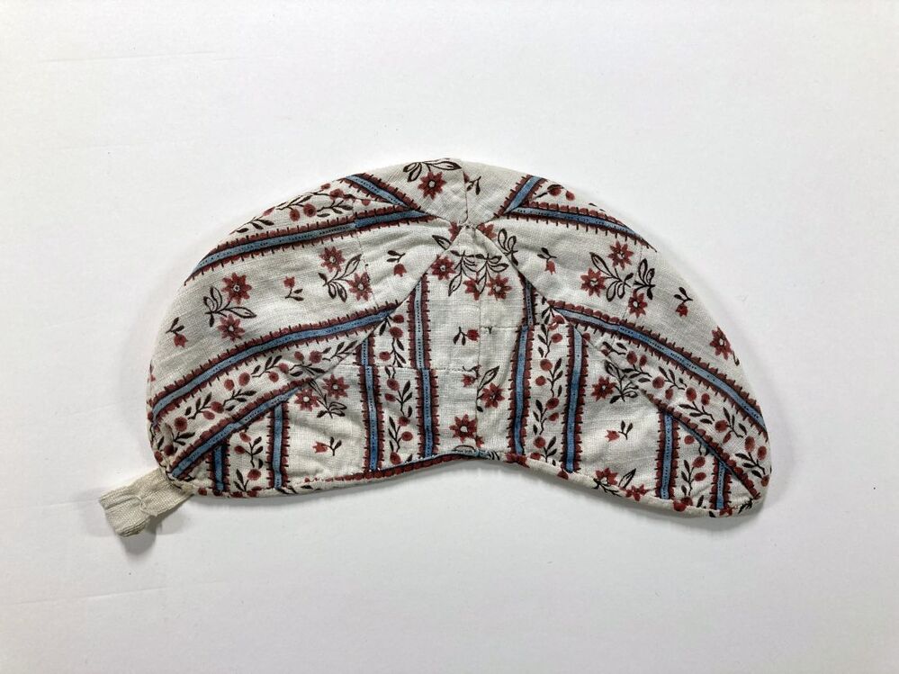 Muts van bedrukte katoen, blauwe strepen met rood-bruine rand en kleine boeketjes, onderdeel van groep kinderkleding