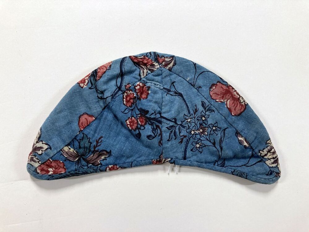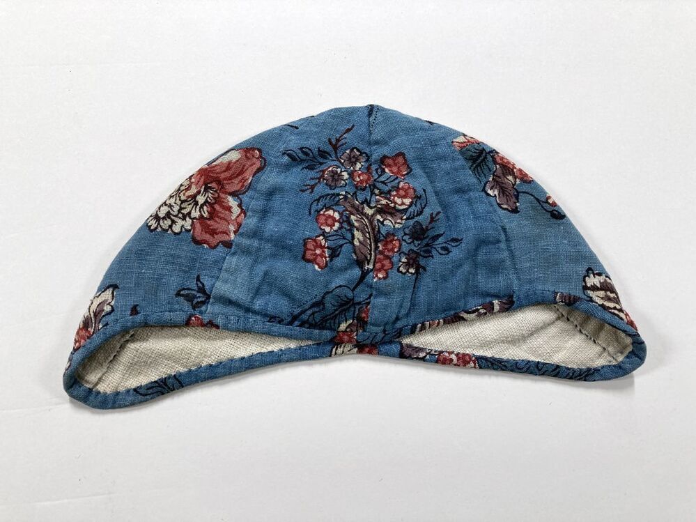 Sitsen jongensmuts, met bloemmotieven op blauwe grond