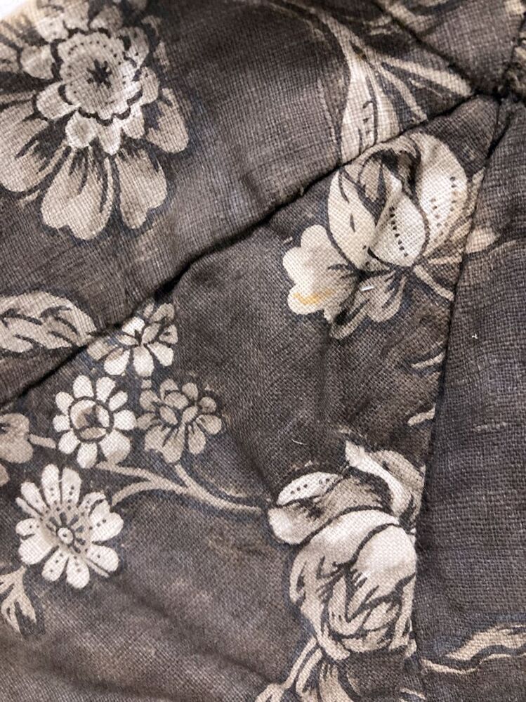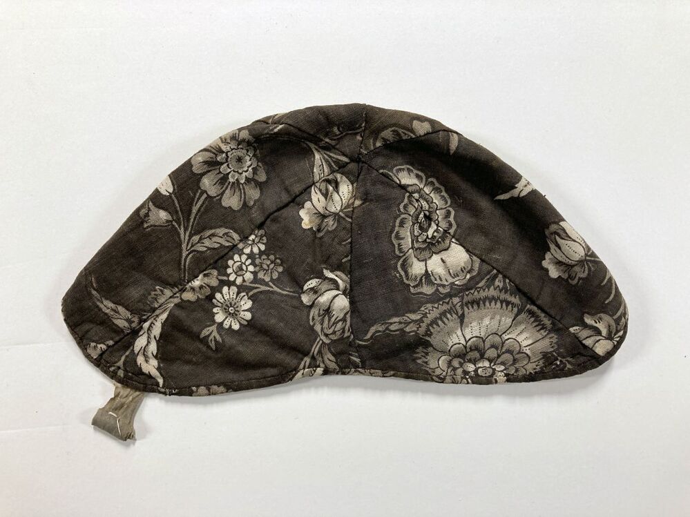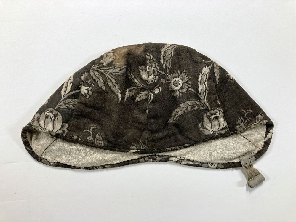 Mutsje van bedrukte katoen, donkerbruin fond met bloemen, onderdeel van groep kinderkleding