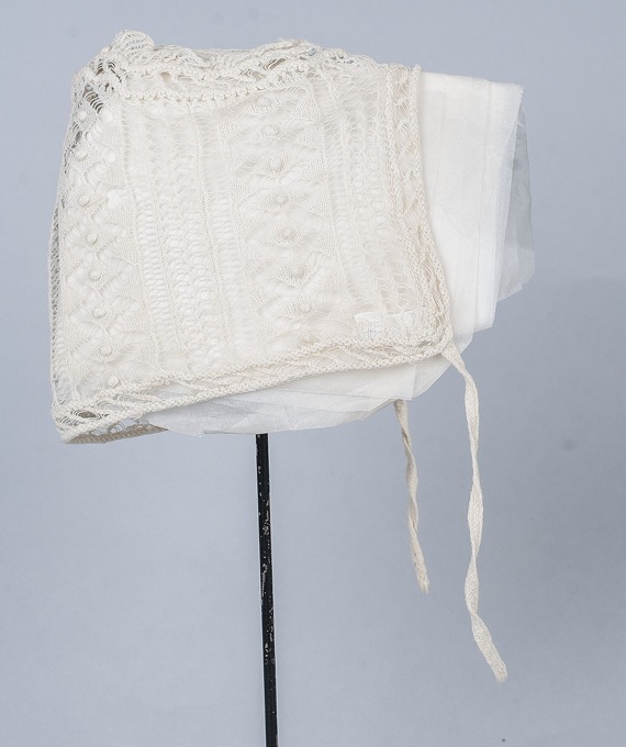 Ajour gebreid mutsje van ragfijne katoen met nopjes, onderdeel van groep kinderkleding