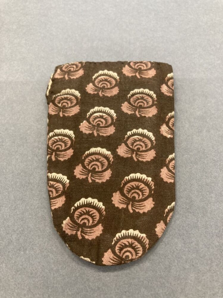 Enkel mofje van bedrukte katoen, bruin fond met roze en witte bloemen, onderdeel van groep kinderkleding
