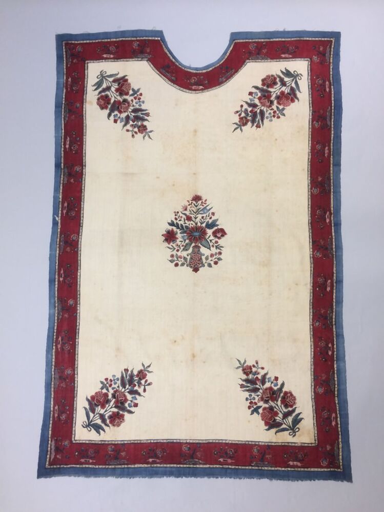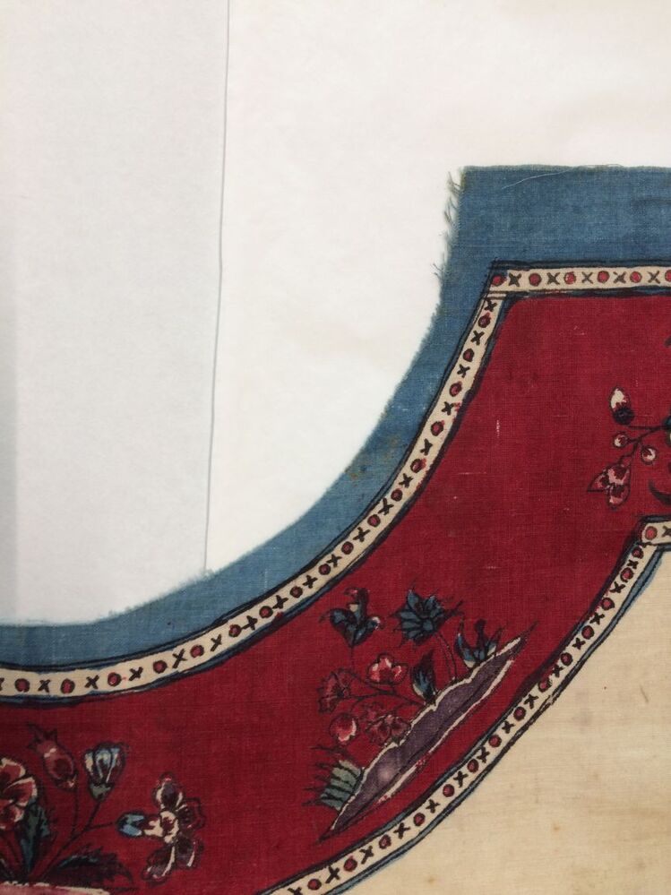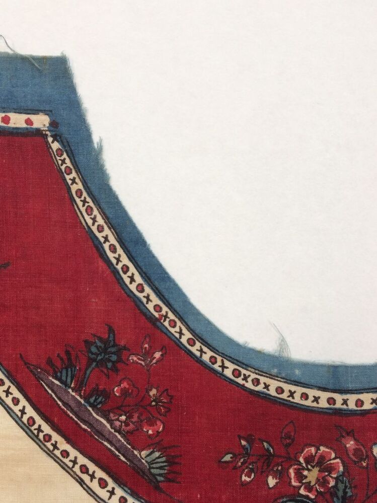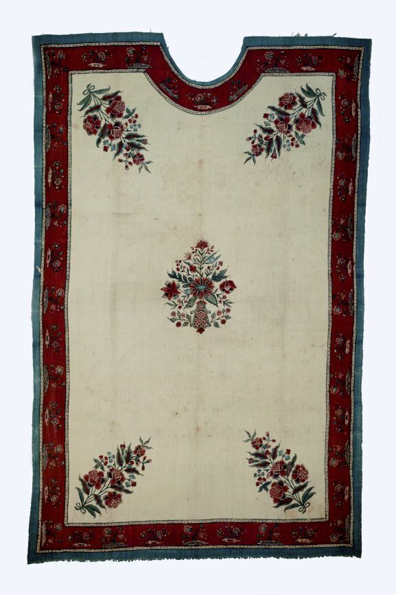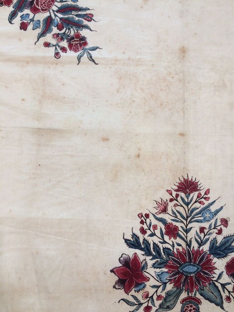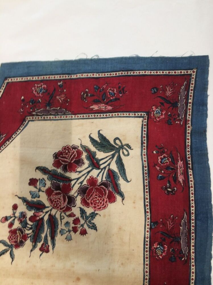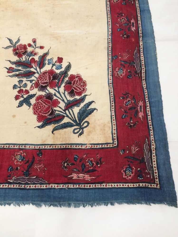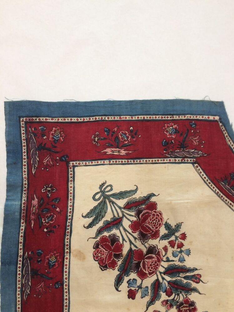 Sitsen scheerdoek beschilderd met boeketten, in de hoeken en centraal in het midden op witte grond, rondom rand met plantjes op rode grond