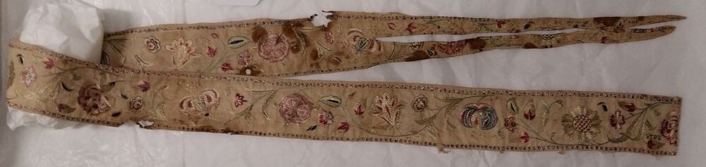 Wimpel van fijn wit linnen, geheel versierd met geborduurde bloemen en bladeren van gekleurde zijde