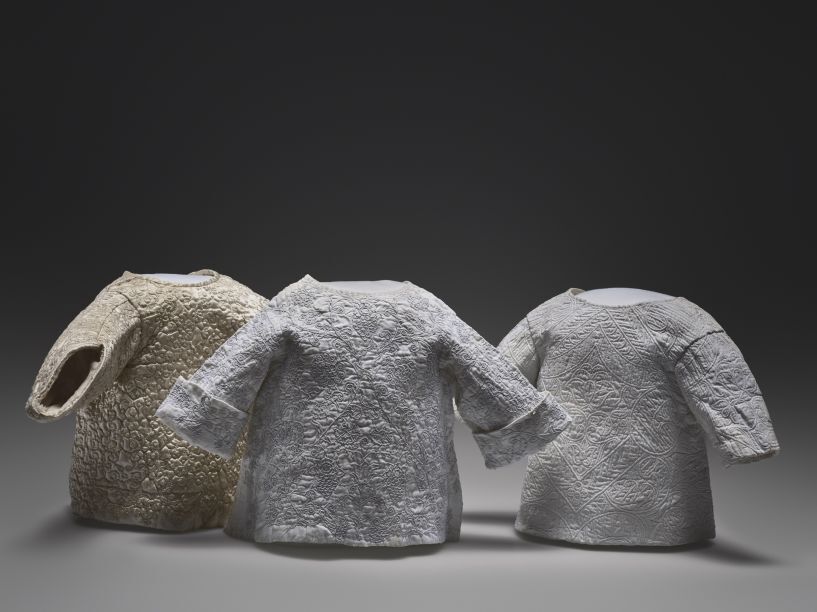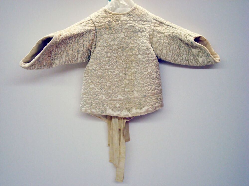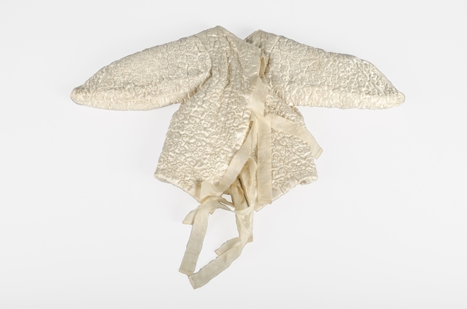 Jakje van crème zijde in satijnbinding versierd met krulpatroon in matelassé.