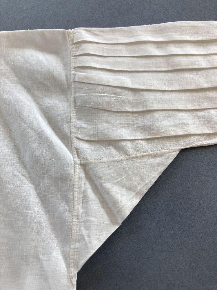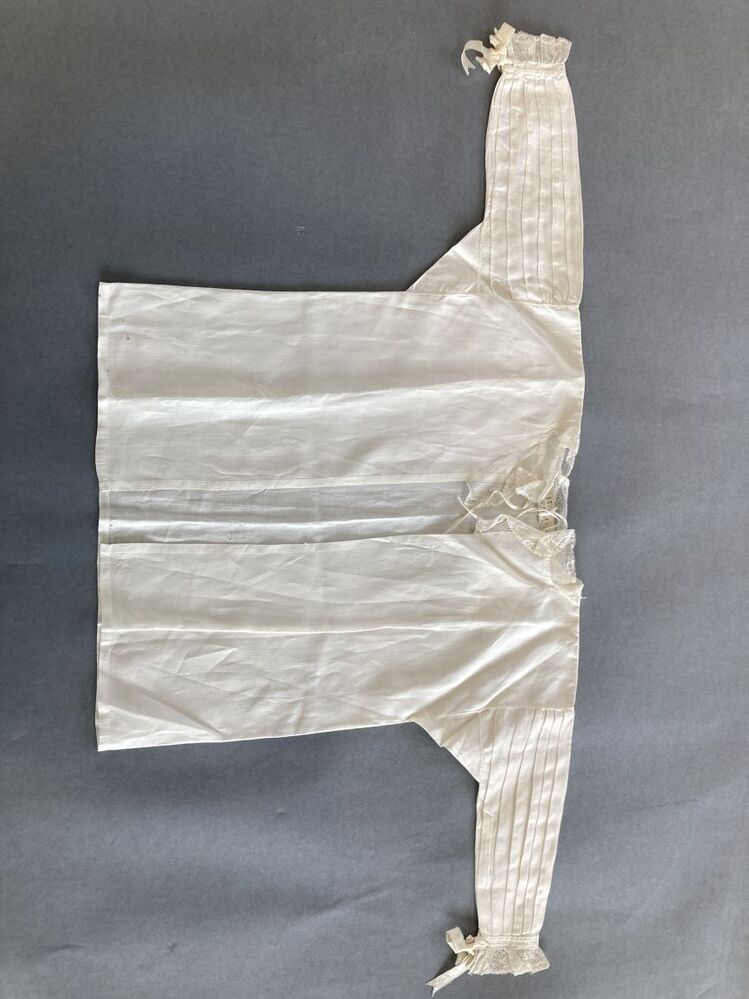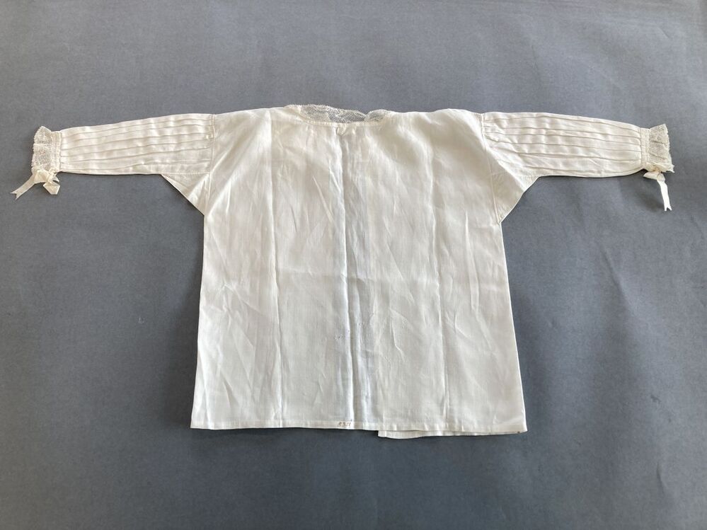 Jongenshemd van fijn wit linnen met geplooide mouwen, verfraaid met point de paris kloskant