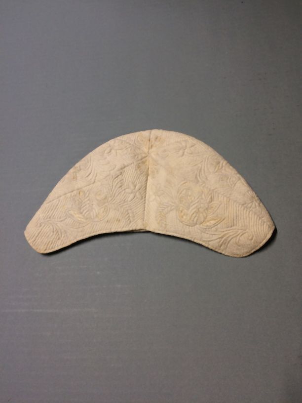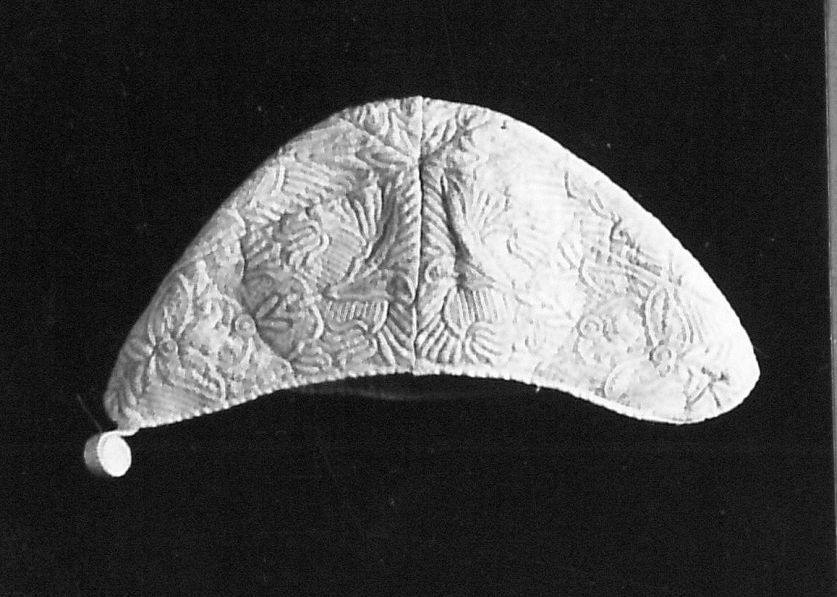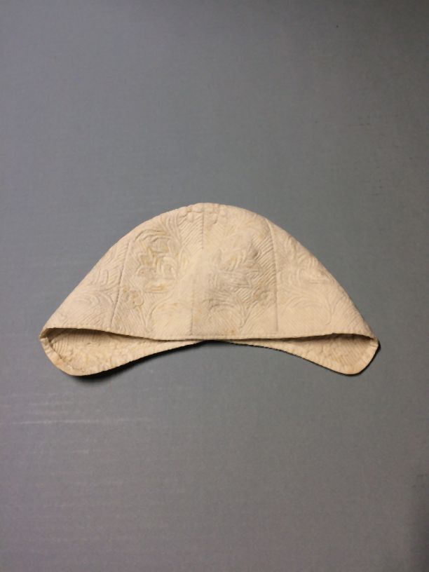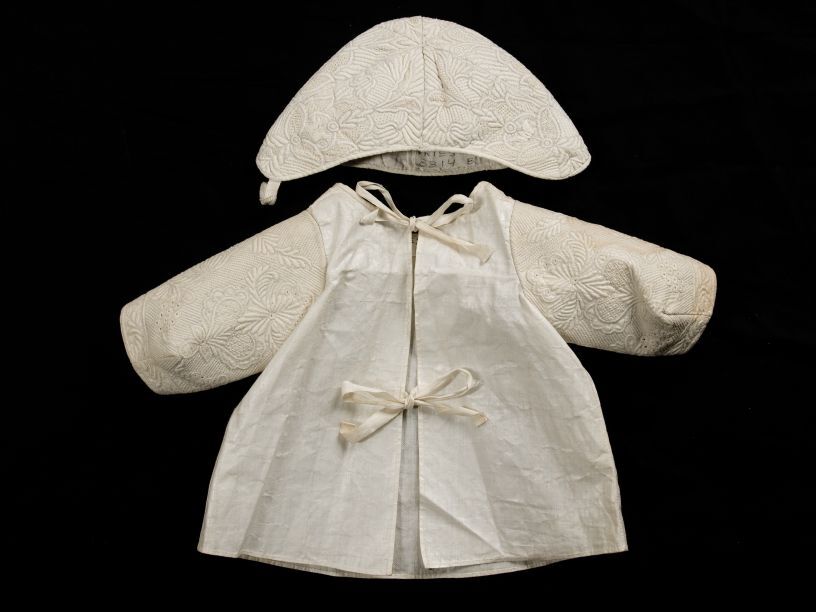 Jongensmutsje van witte katoen met Zaans stikwerk, onderdeel van groep van drie