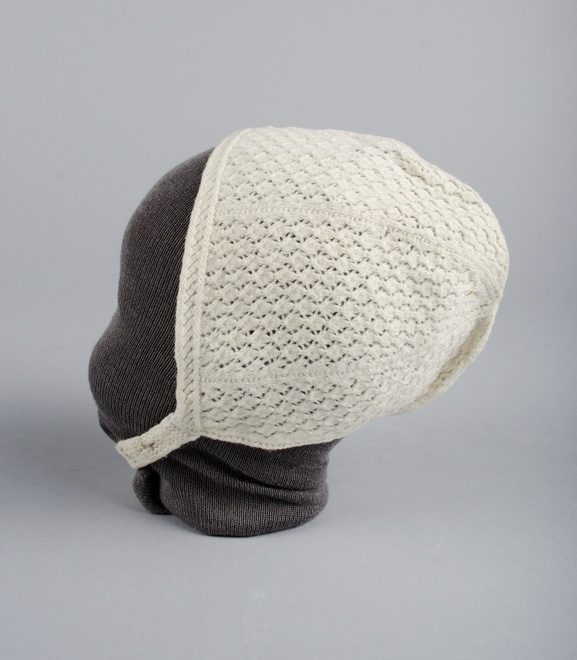 Jongensmutsje van wit katoen ajour gebreid met zes partjes, onderdeel van groep van vijf