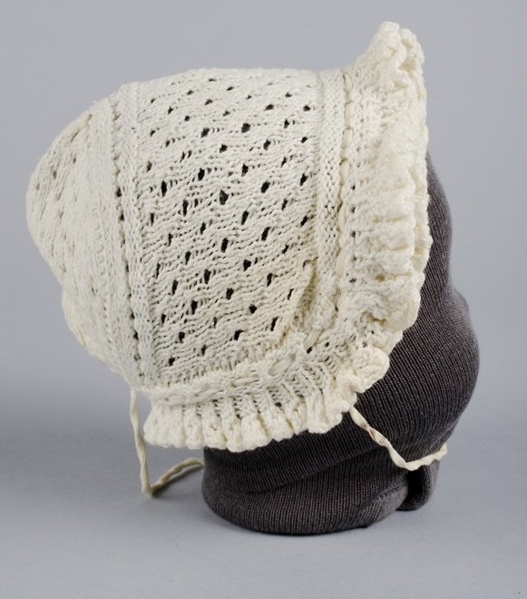Mutsje van witte katoen ajour gebreid met strookjes, onderdeel van groep van vijf