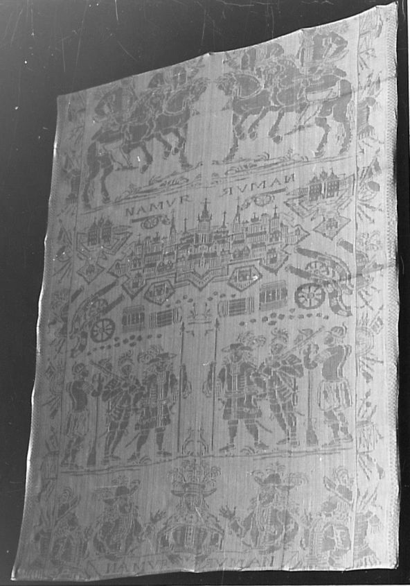 Servet van wit linnen damast met ingeweven de verovering van Namen door Stadhouder Willem III Koning van Engeland en Max. Emanuel, vorst van Bavaria 1695, onderdeel van groep van vier