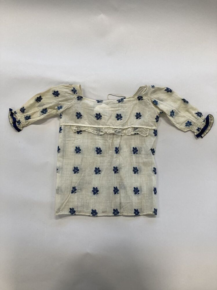 Japonnetje van fijn wit katoen met blauwe blaadjes versierd