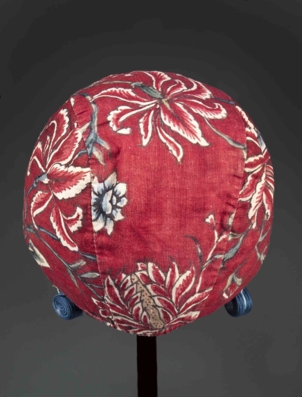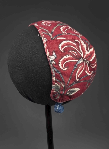 Sitsen meisjesmuts, met lelie-achtige bloemen op rode grond,