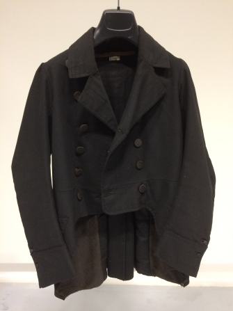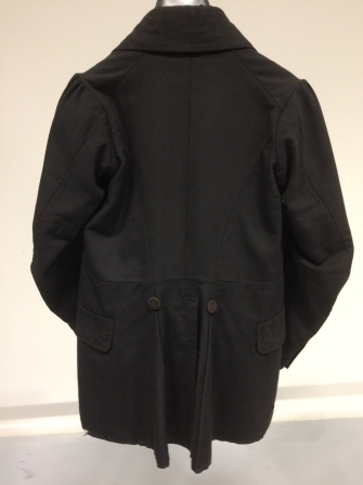 Zwart lakense jas met grove baaien voering en dubbele rij stoffen knopen