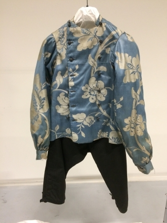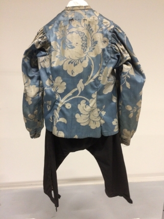 Kort baeitje of mannenvest van blauw damast met ingeweven witte, grote bloemen