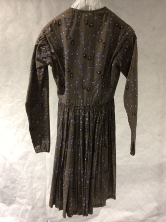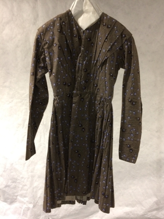 Schootjak van bedrukt katoen met bruine imitatie-keper grond en ranken met blauwe bloemen, lange mouwen