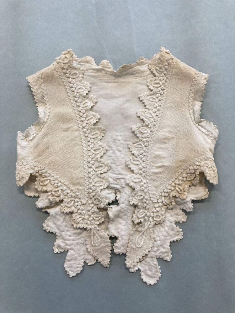 Kinderlijfje van wit piqué met lint versiering en twee knoopjes