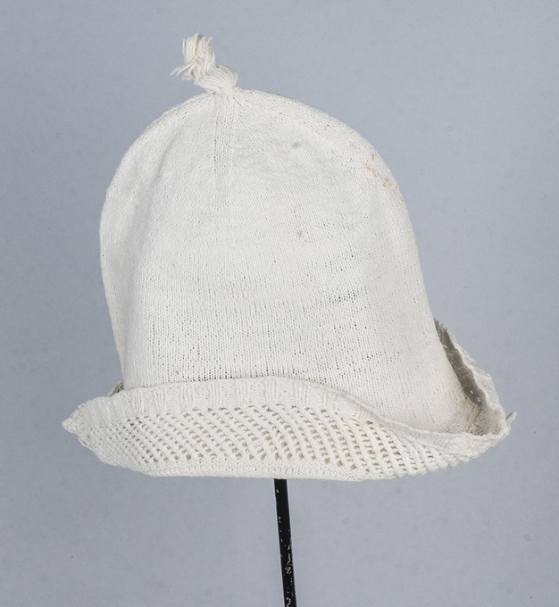 Slaapmuts jongen, ajour gebreid van wit katoen, met kwast