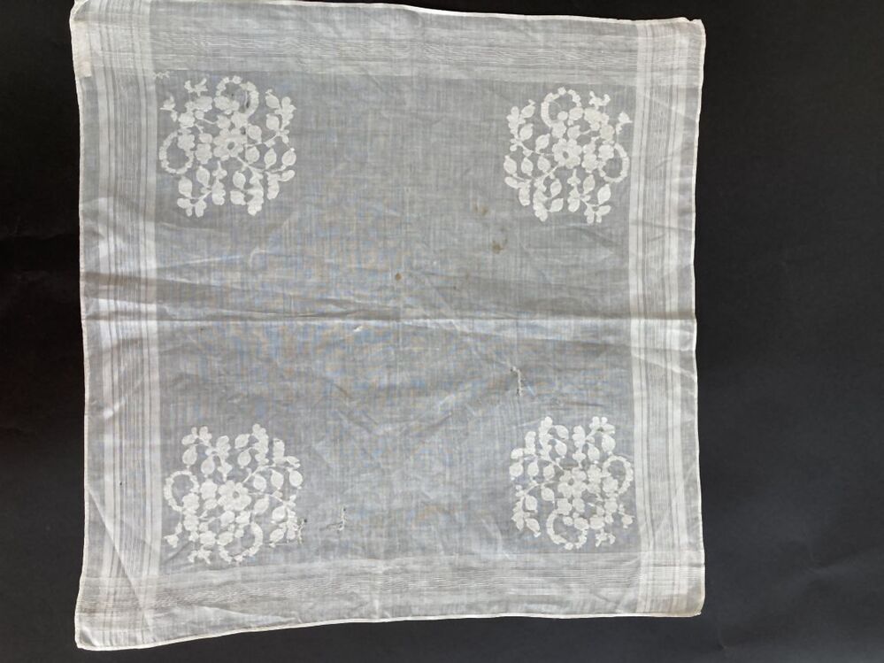 Zakdoek van wit batist met ingeweven streepbundels en bloembouquetten in de hoeken