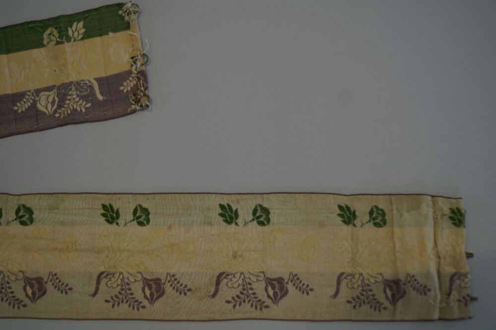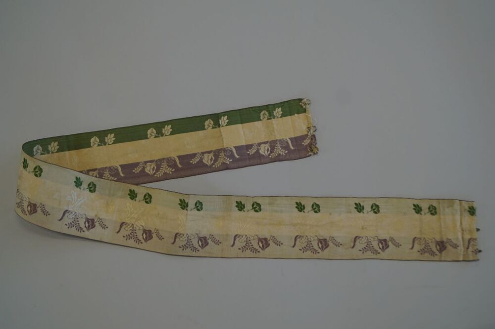 ribszijden lint met bloemtakken in verticale lengstestreep in lila, zachtgeel, crème en groen