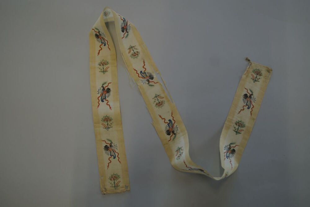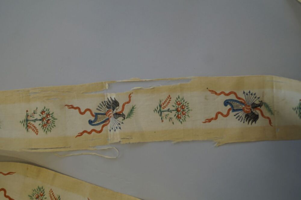 Zijden oranjelint waarop boom met oranje appels en adelaar met overwinningstak, gebruikt als zonhoedlint