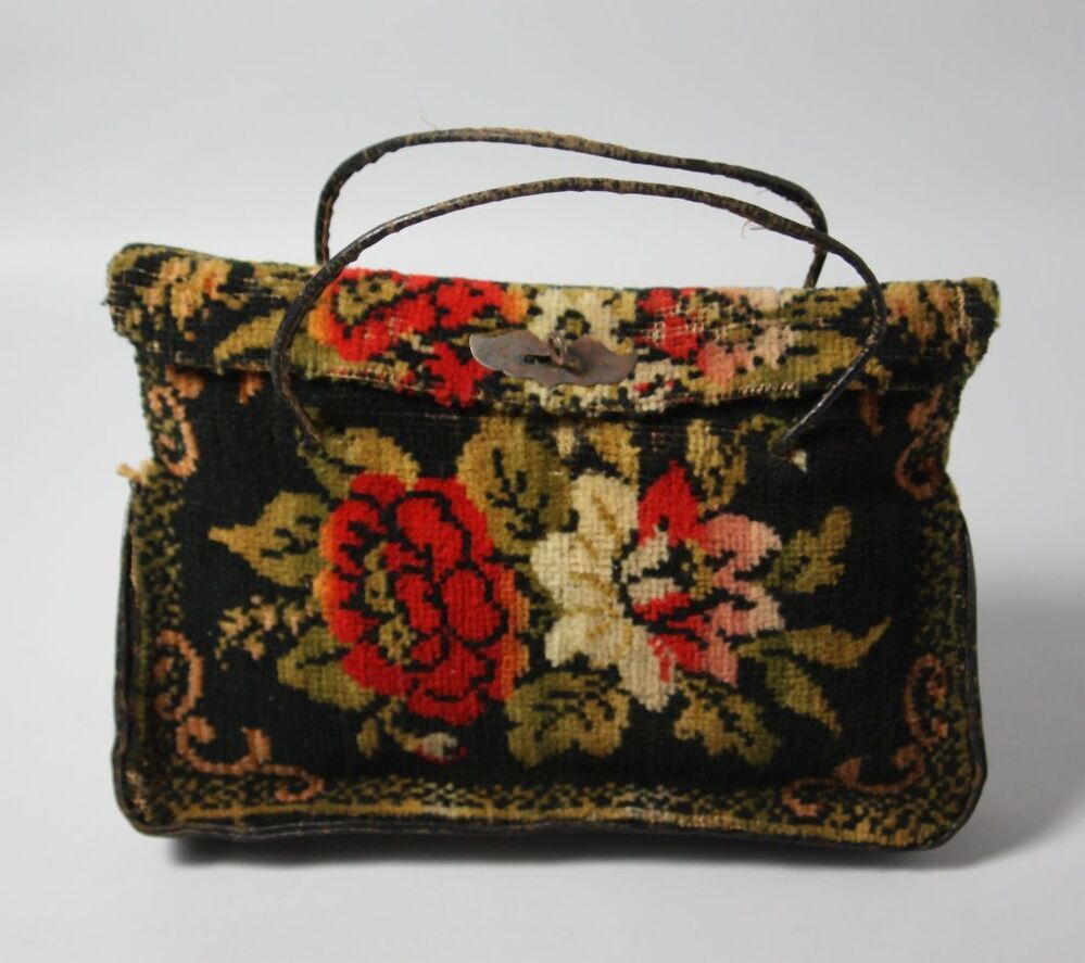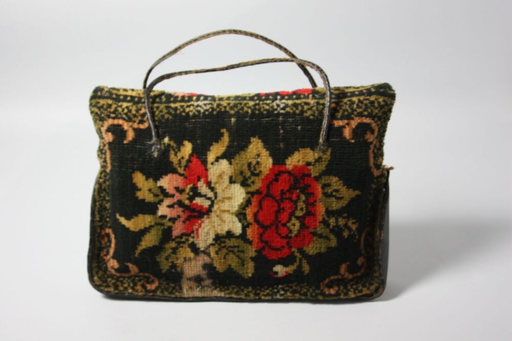 Karabies, geschoren wol borduursel met leren zijkant en hengsel
