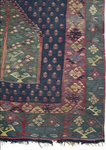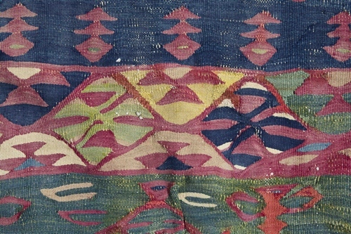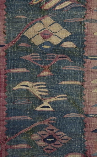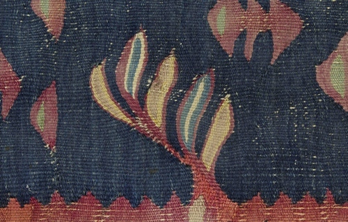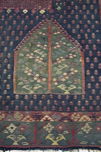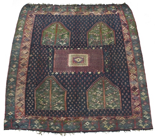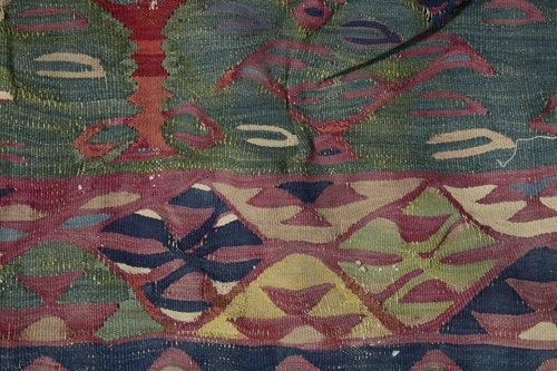 Tapijt van hlin weefsel, blauwe grond met rood strooimotief, groene vlakken met levensbomen