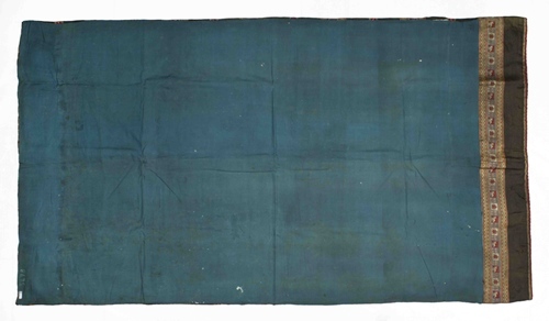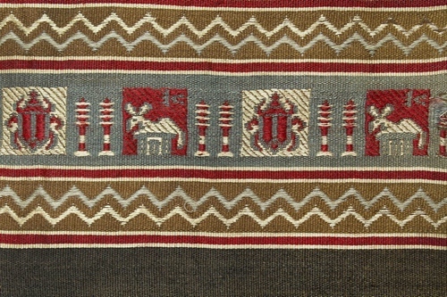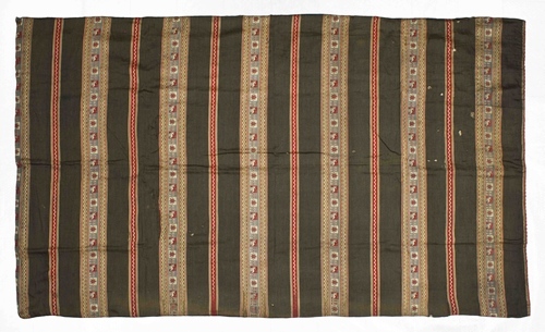 Gordijn, zwart met horizontale banden, versierd met Egyptische banden, onderdeel van groep van drie