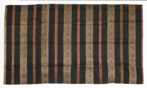 Gordijn, zwart met horizontale banden, versierd met Egyptische banden, onderdeel van groep van drie