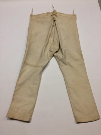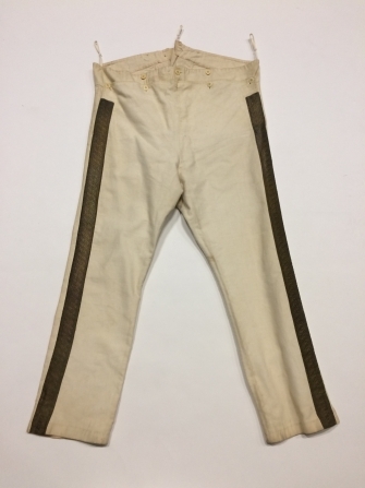 Kostuum, witte lange broek van moleskin met klepsluiting en galonband
