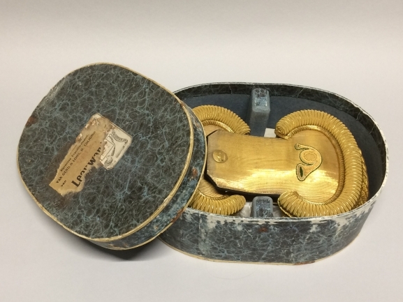 Paar gouden epauletten in doos, onderdeel van houtvesterskostuum