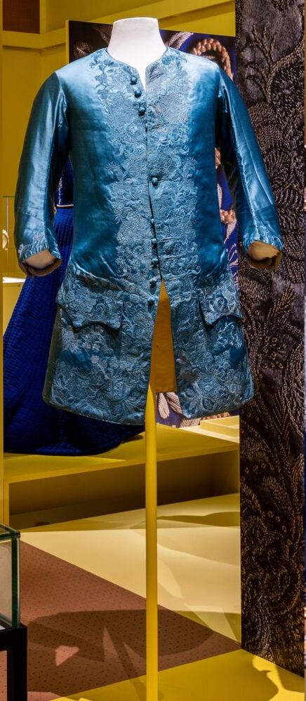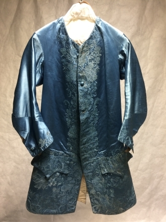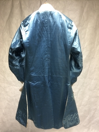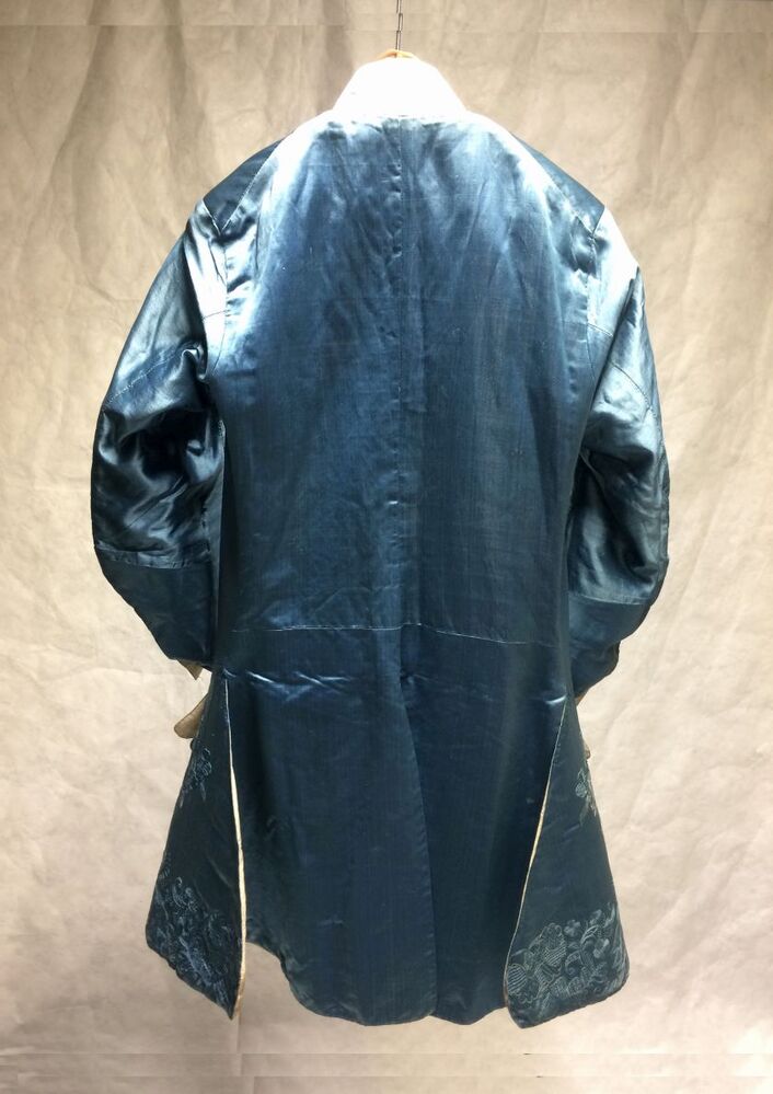 Vest of kamizool met lange mouwen van van blauw satijn met borduurwerk langs voorpanden en pols