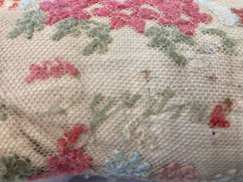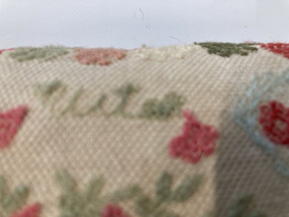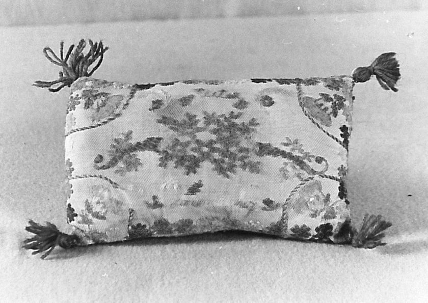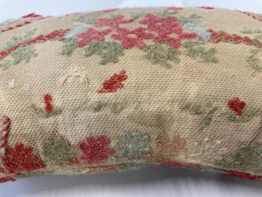 Speldenkussen van katoen overtrokken met tule, doorgestopt met wol, rode pompoen op de hoeken