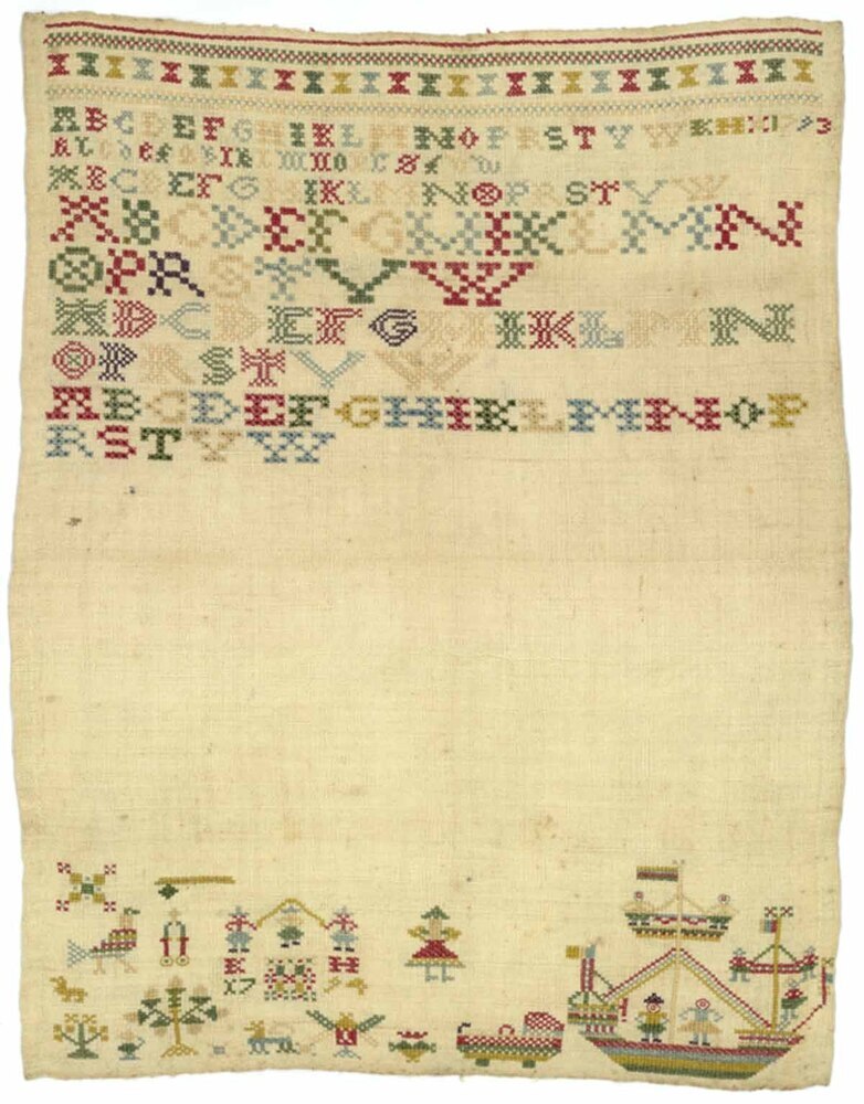 Lettermerklap, onaf, met heldere kleuren, gemerkt K.H. 1793-1794