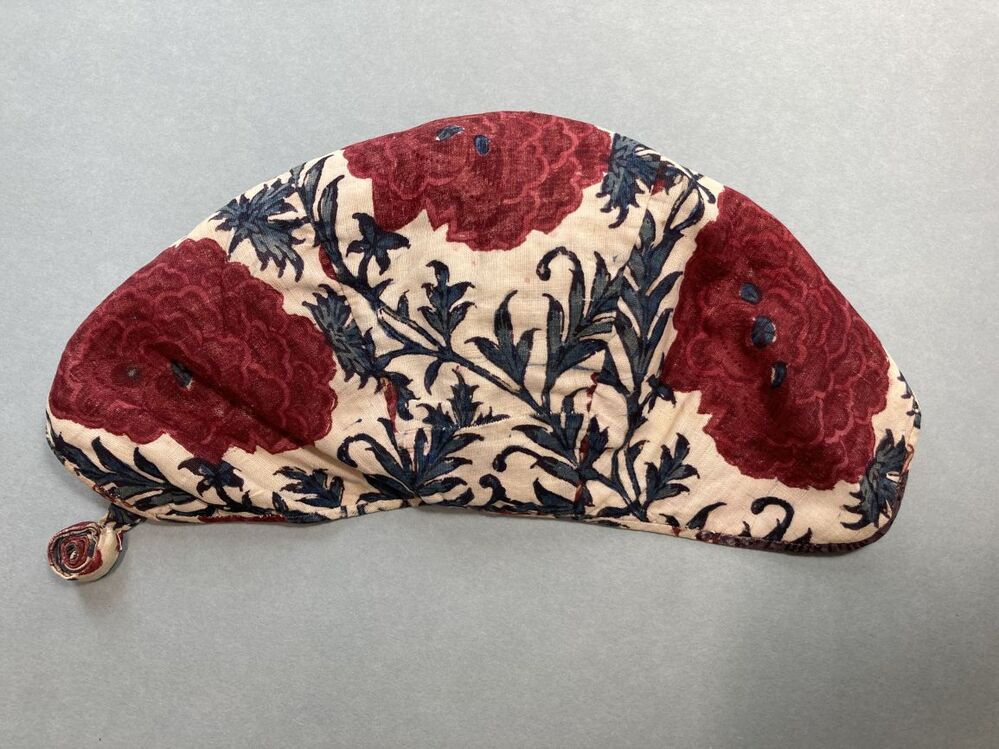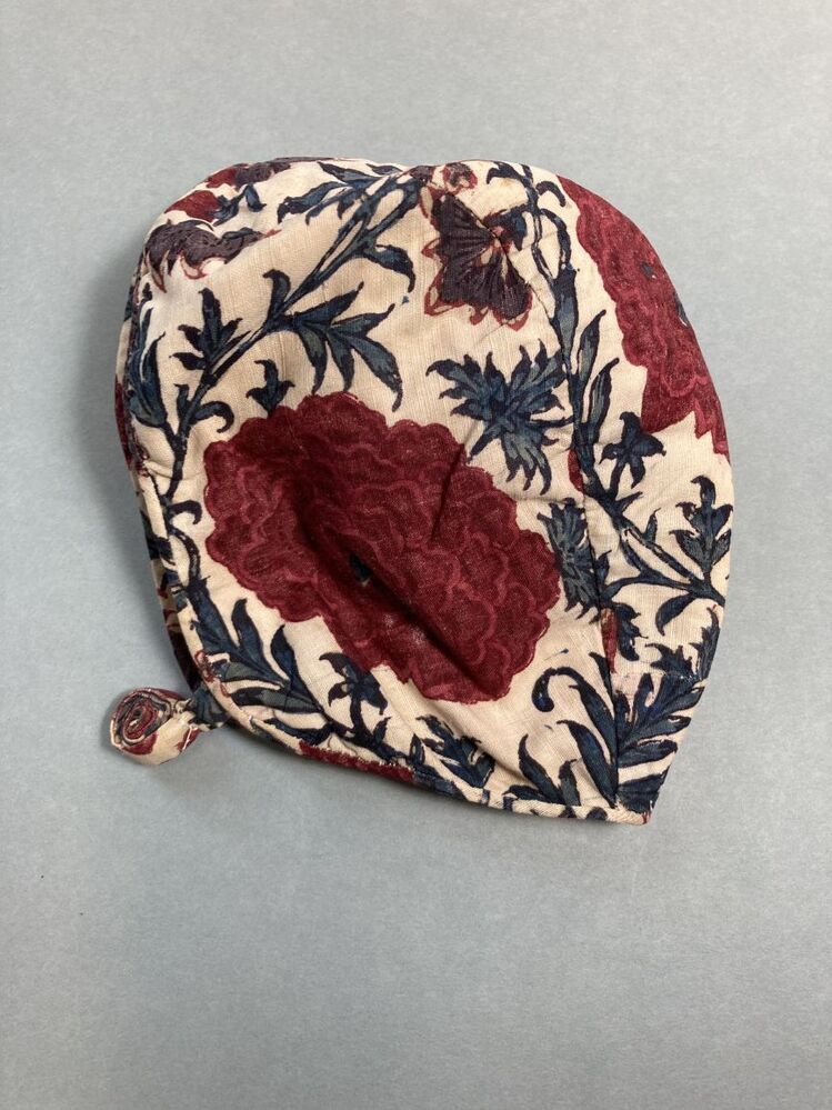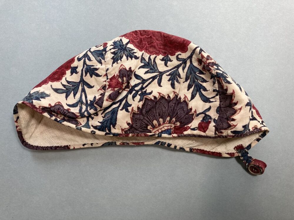 Sitsen meisjesmuts, met stevige bloemranken op witte grond,
