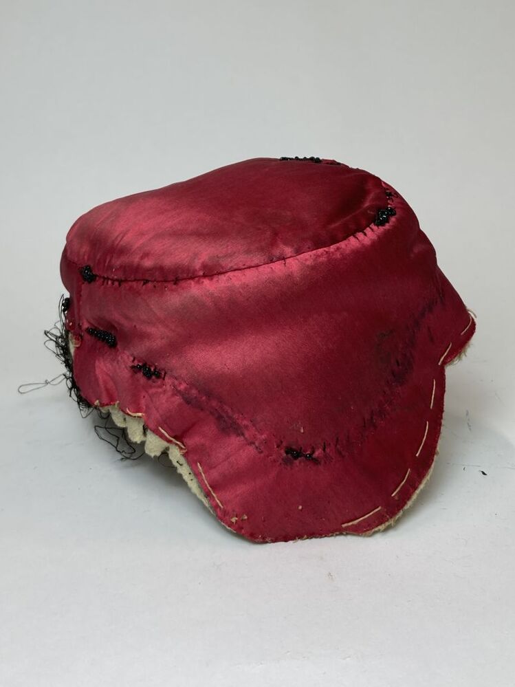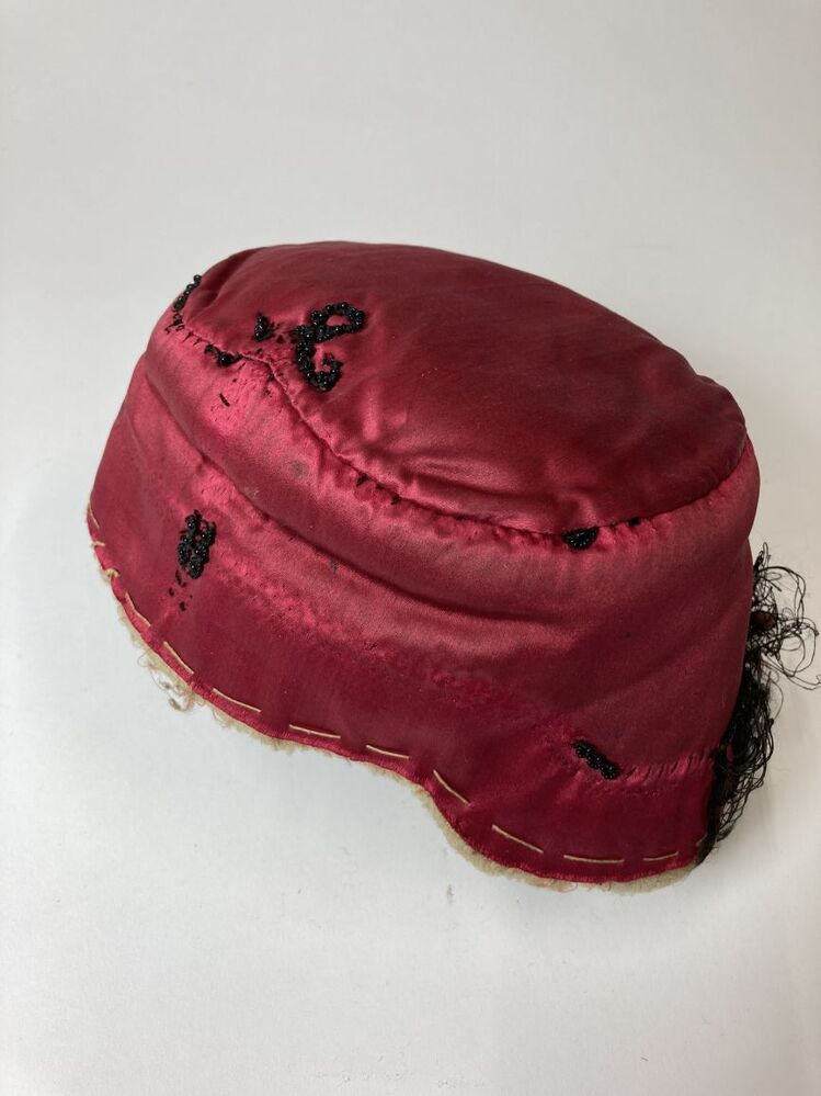 Klappe van rode zijde, langs de zwarte rand en langs de naden hebben vroeger kralen gezeten
