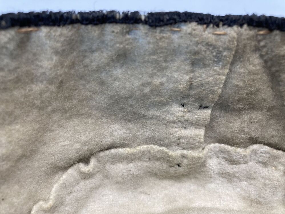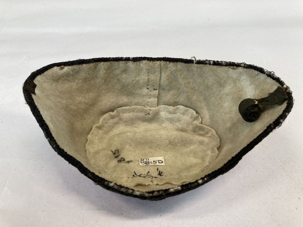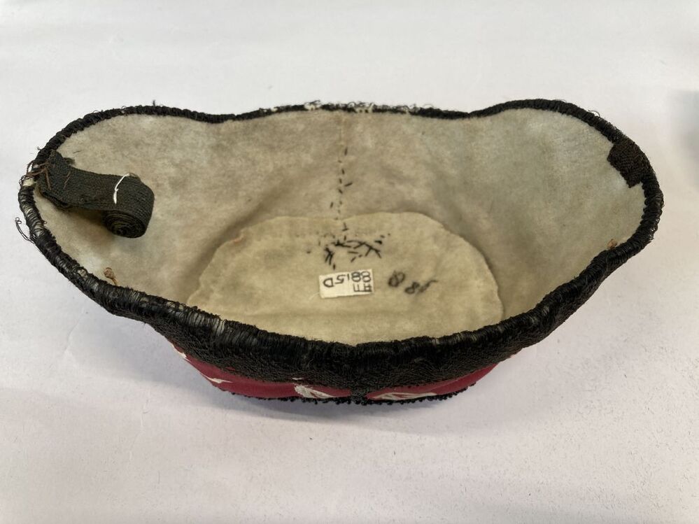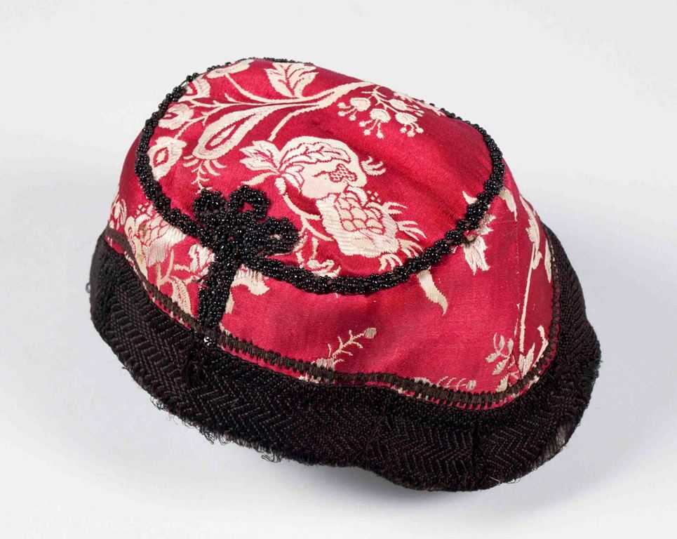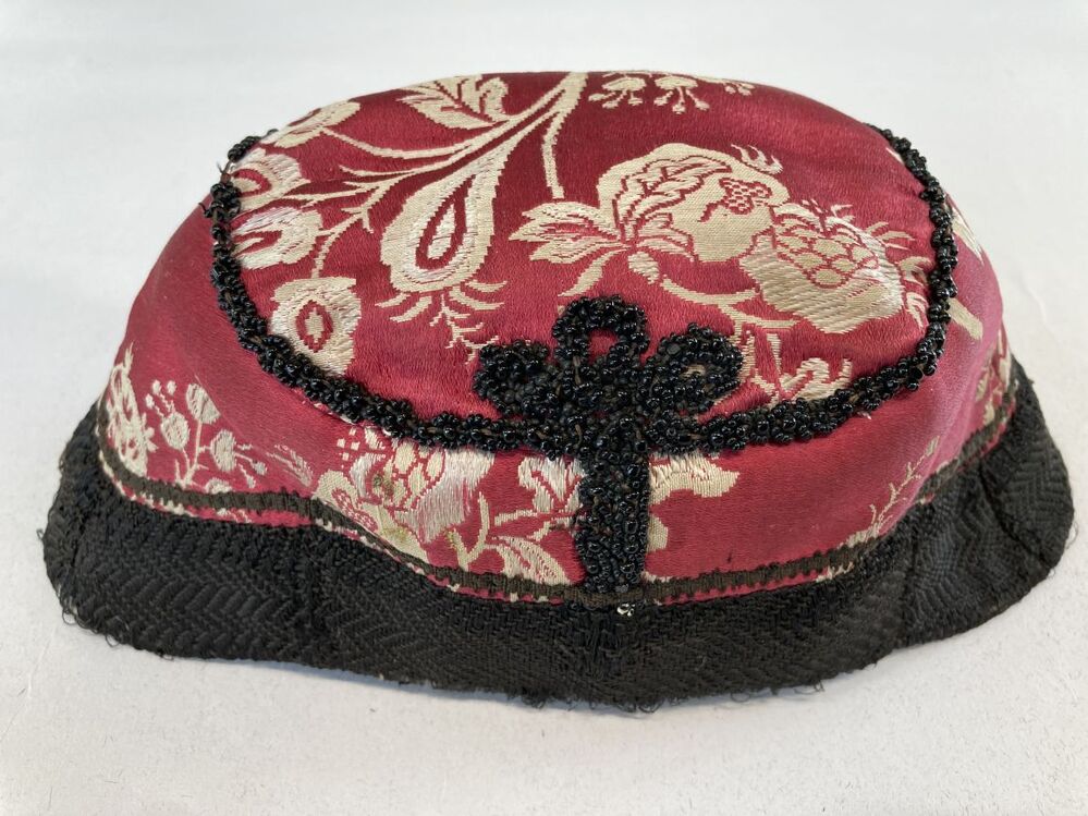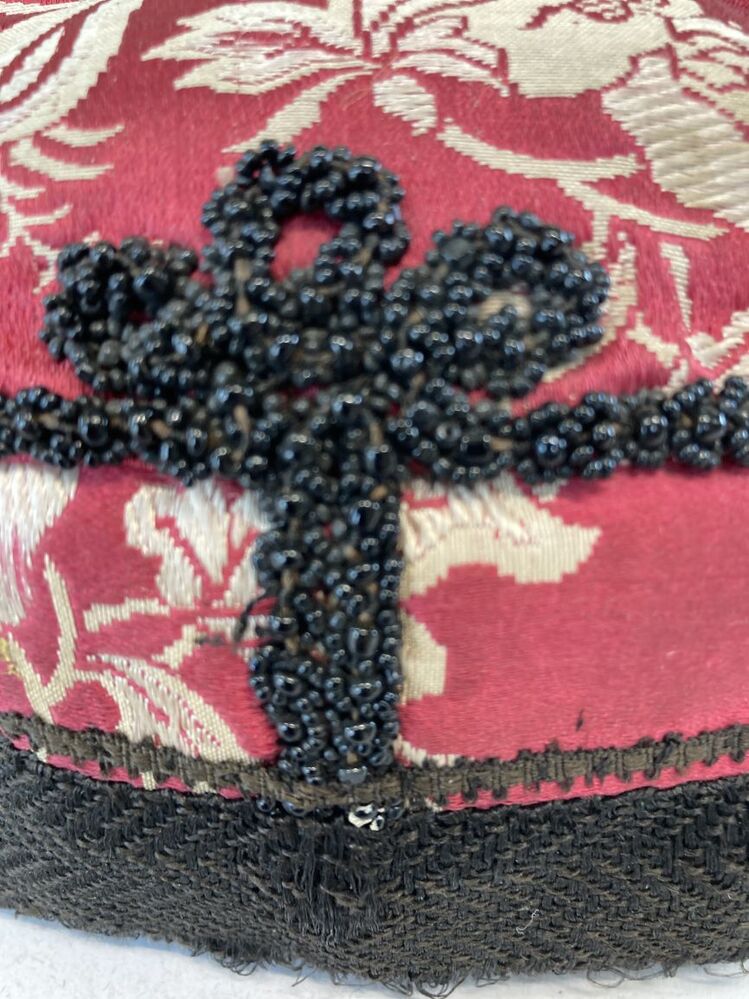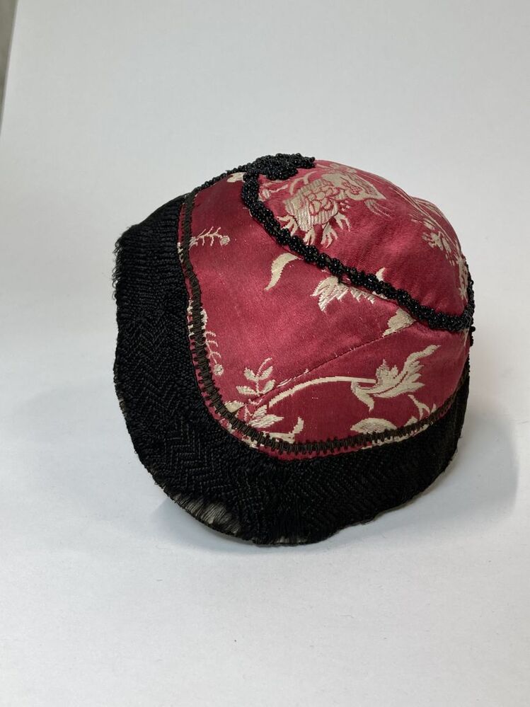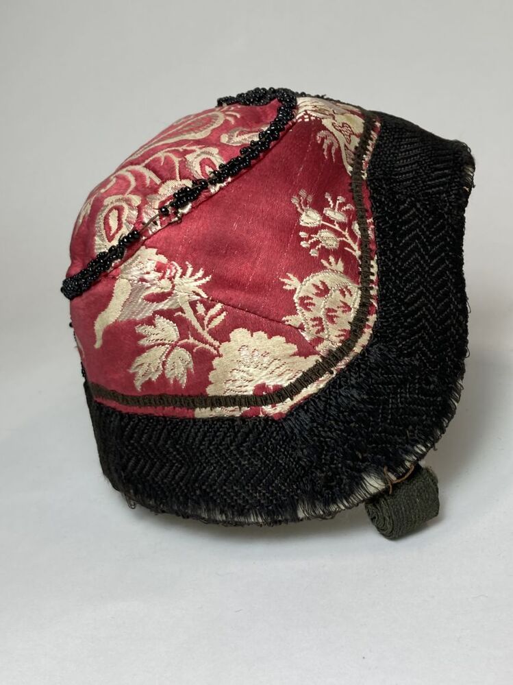 klappe(rt) van rood-witte Chinese zijden damast, langs de naden een kraalrand